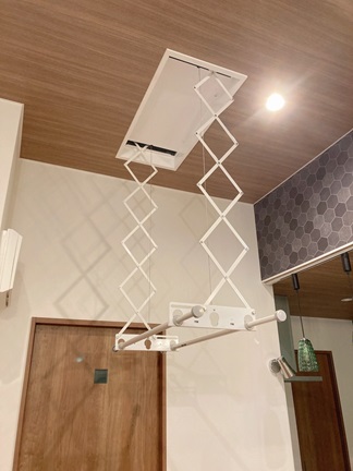 壁のボタンを押すと天井から物干しが!干したまま上げれば邪魔になりません。