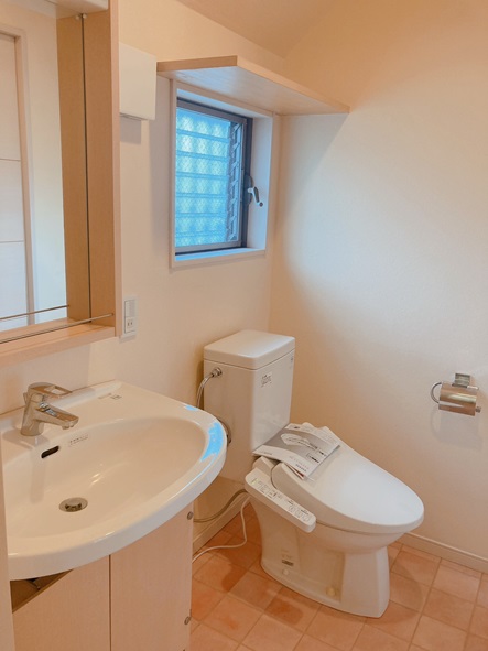 洗面台は明るい木目で。デザイン性の高い鏡を設置するなど女性向け物件ということを意識した造りにしてあります。